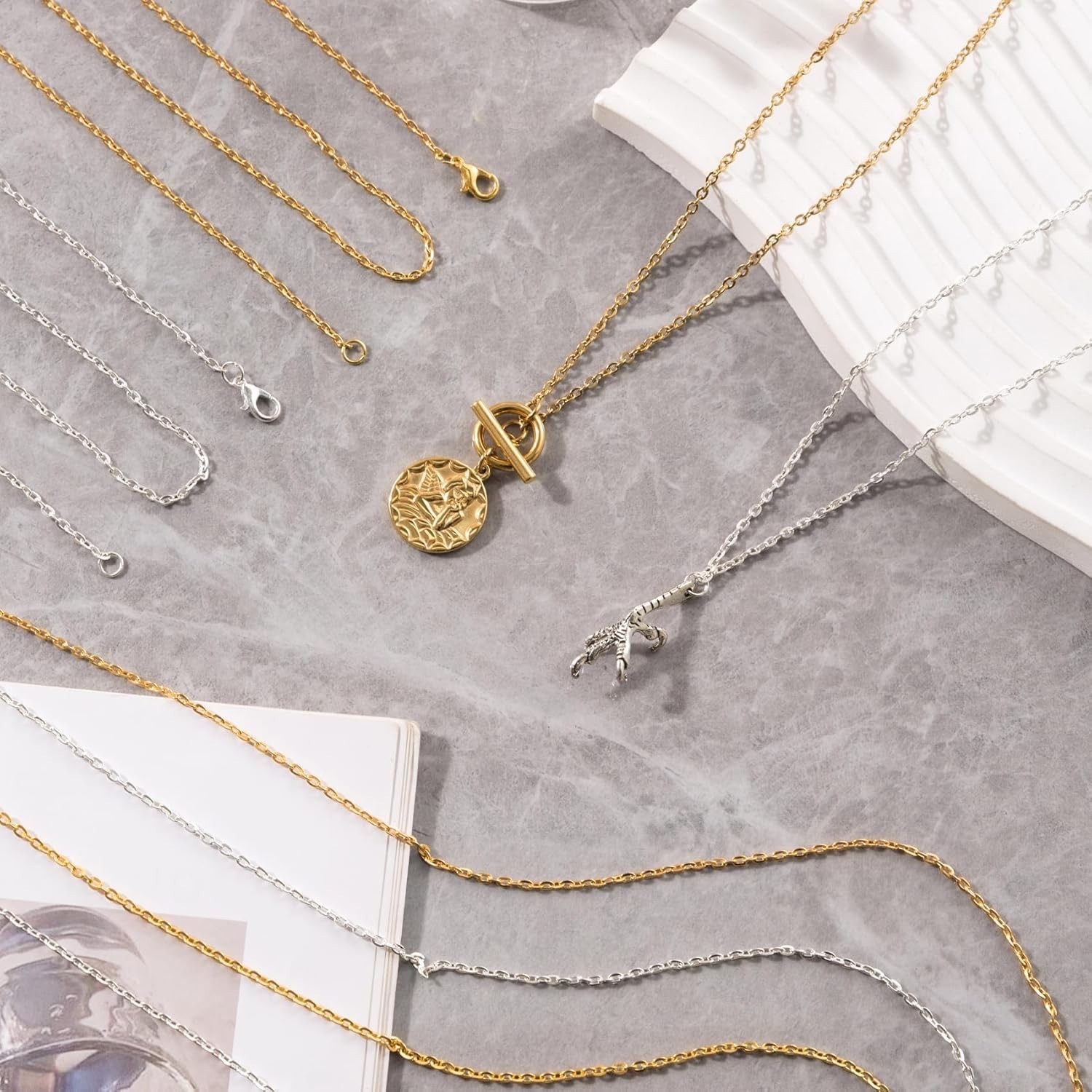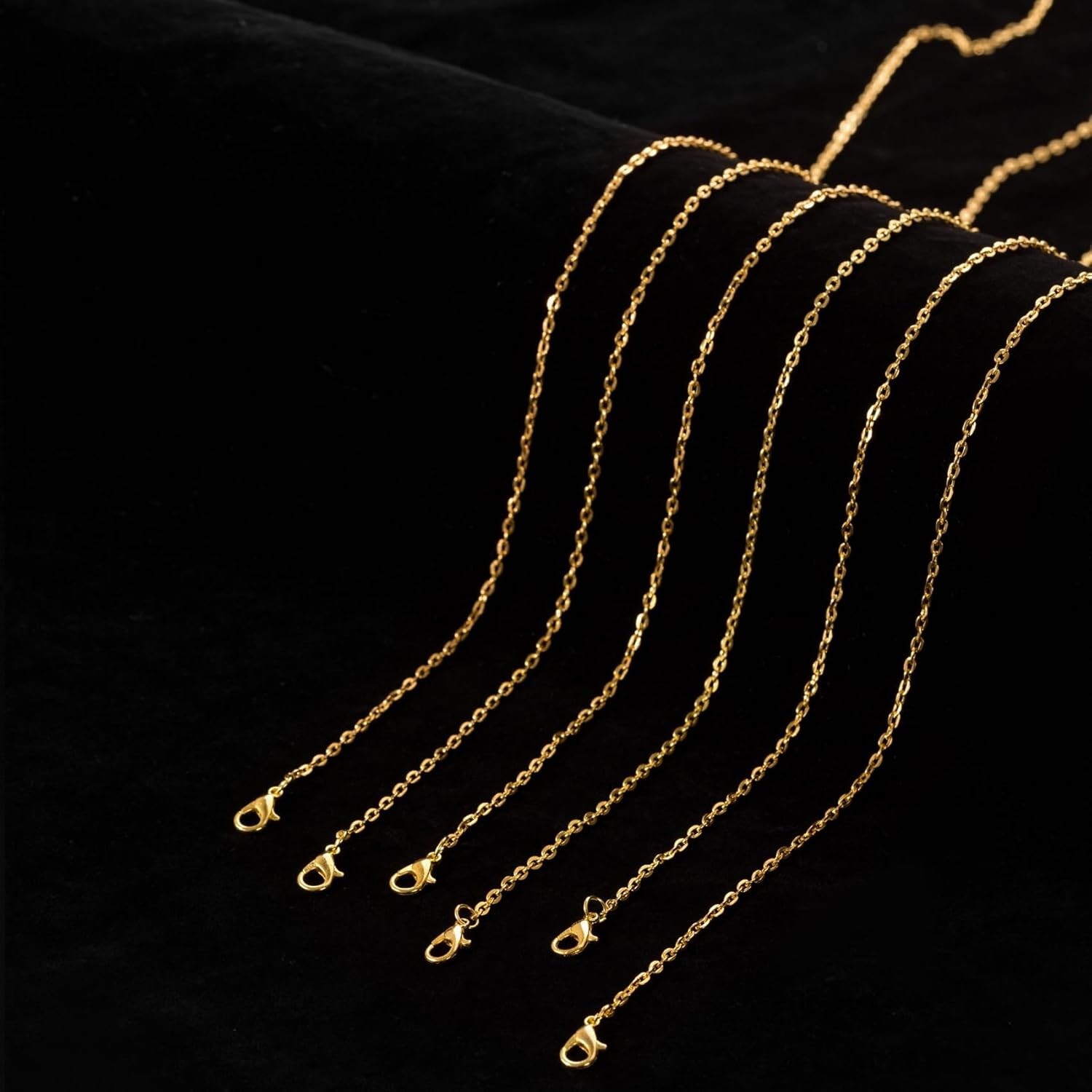 24 Pack Necklace Chains Bulk,Gold and Silver Plated DIY Cable Link Chains for Jewelry Making 18 InchesPackage Included:24 pack 18inches 2mm necklace chains with lobster clasps,easy to put on and take off, convenient to wear,great for charm necklace jewelry making.Colors: 12 pack Gold chains,12 pack silver chains.Material: The chains are delicately made with durable and lightweight alloyGood Choice:You can hang up the pendants you like, easily get the one and only necklaces. It’s suitable for family activities,exercise Everyone’s hands-on ability. You can also make necklaces and send it to your friends, family as a holiday gift.Tips:In order to prolong the service life of these silver necklace chains, please take off the jewelry necklace when bathing, sleeping, exercising or other strenuous exercises, because prolonged contact with sweat will cause the surface to lose its luster more quickly.