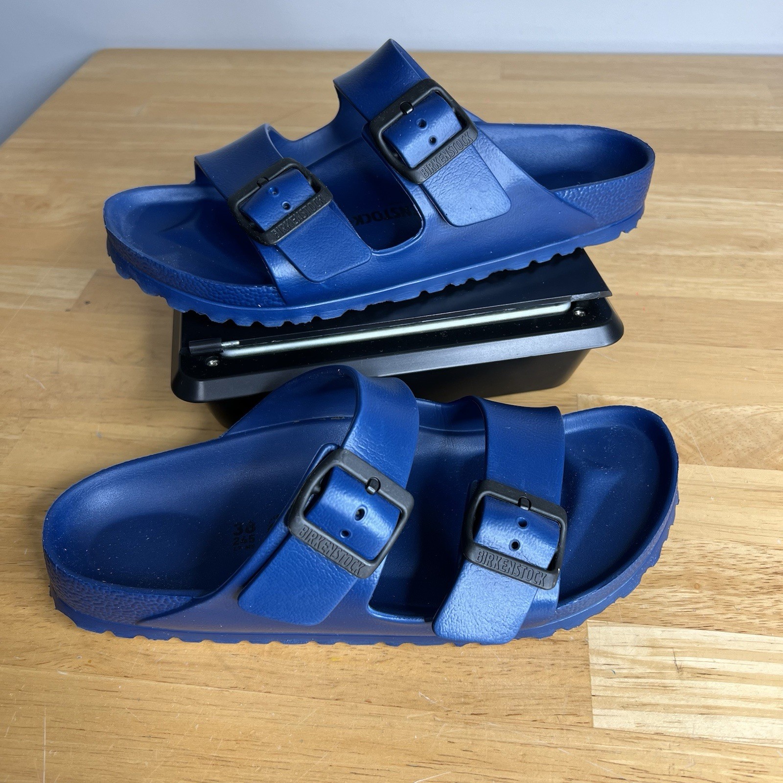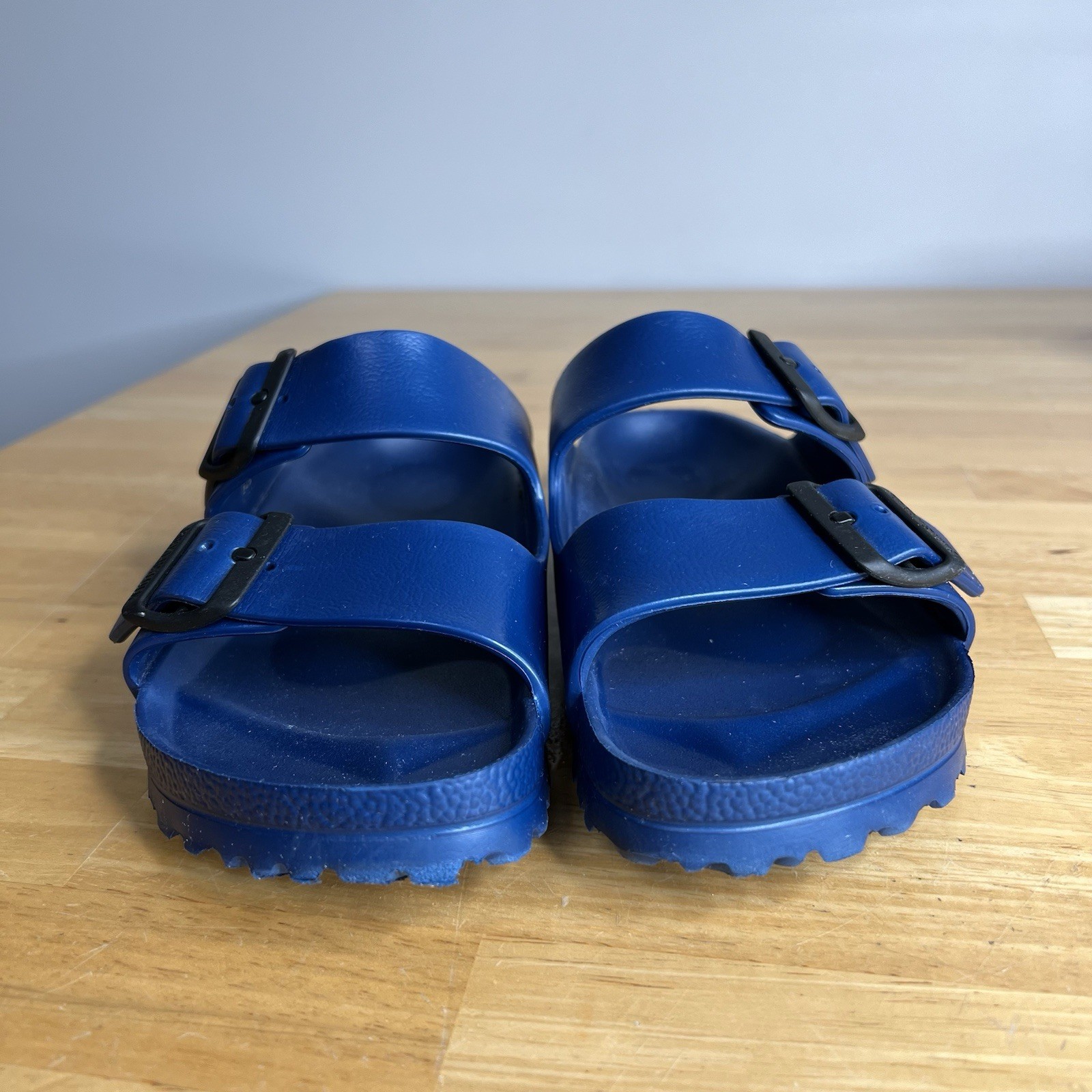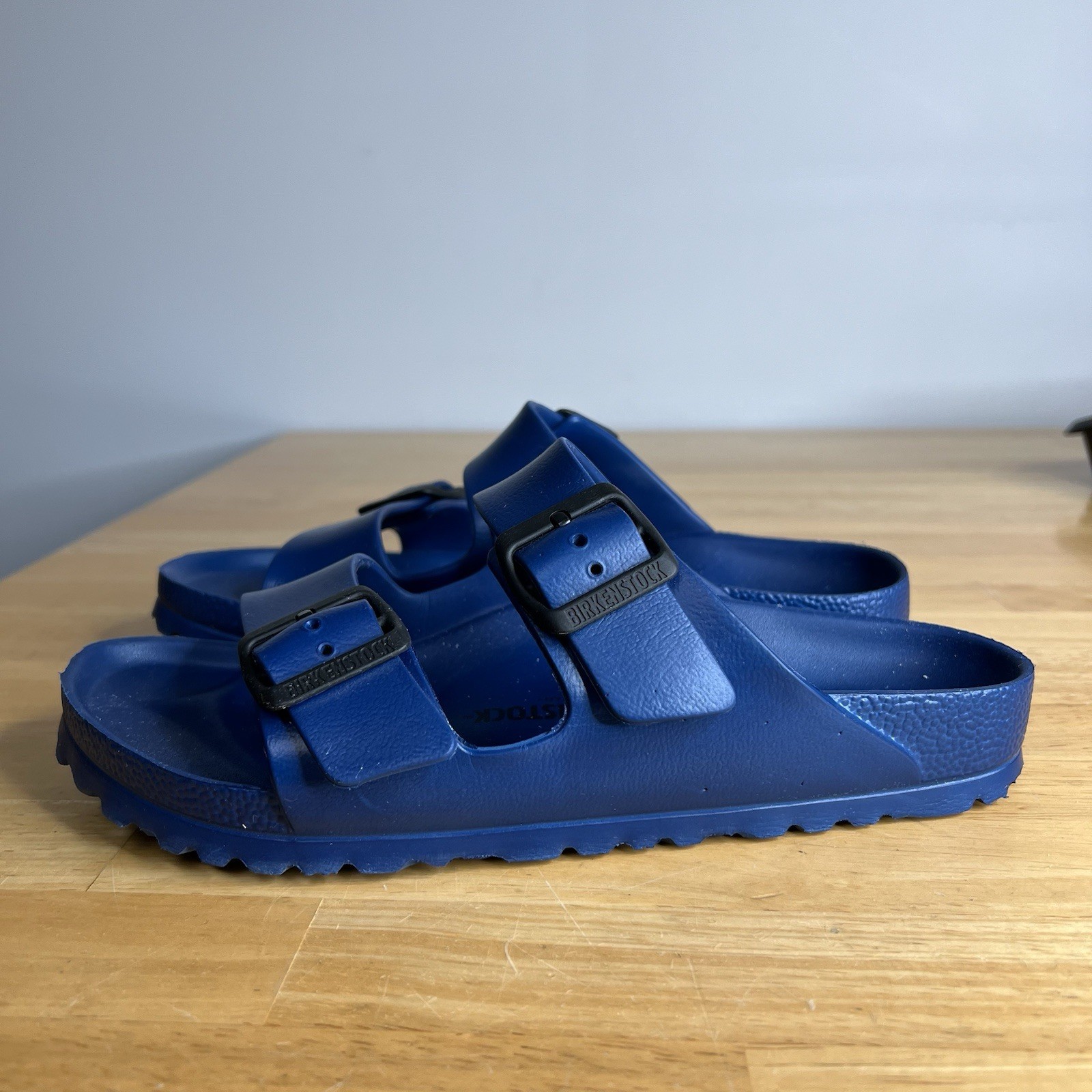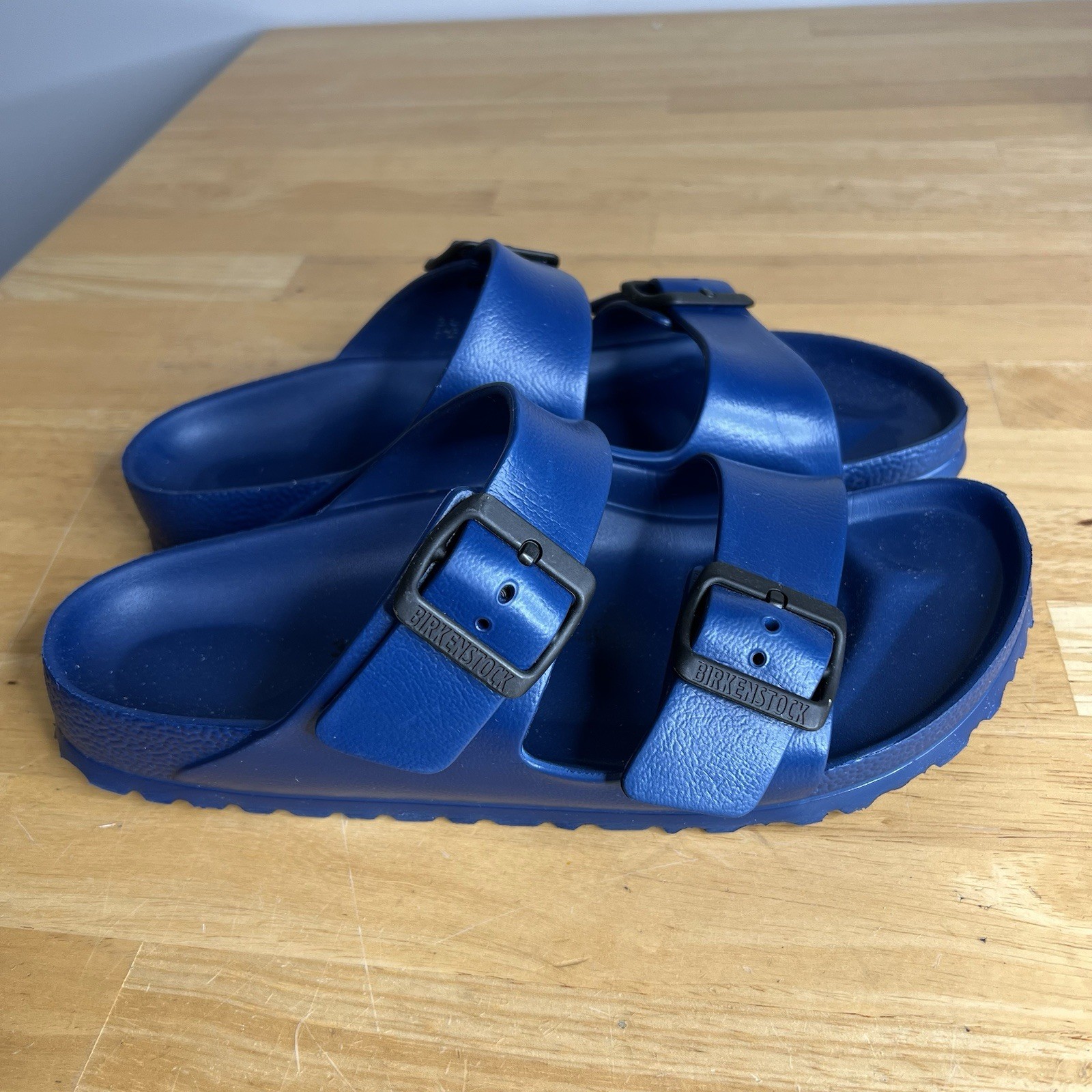 Birkenstock Women Arizona Essentials EVA Sandal Blue Rubber Sz 38 US L7 M5 EUCUS Women’s 7US Men’s 5This item is preowned, excellent used condition. See photos for overall style, condition, and measurements. Photos provide the best description. Ready to wear and enjoy!