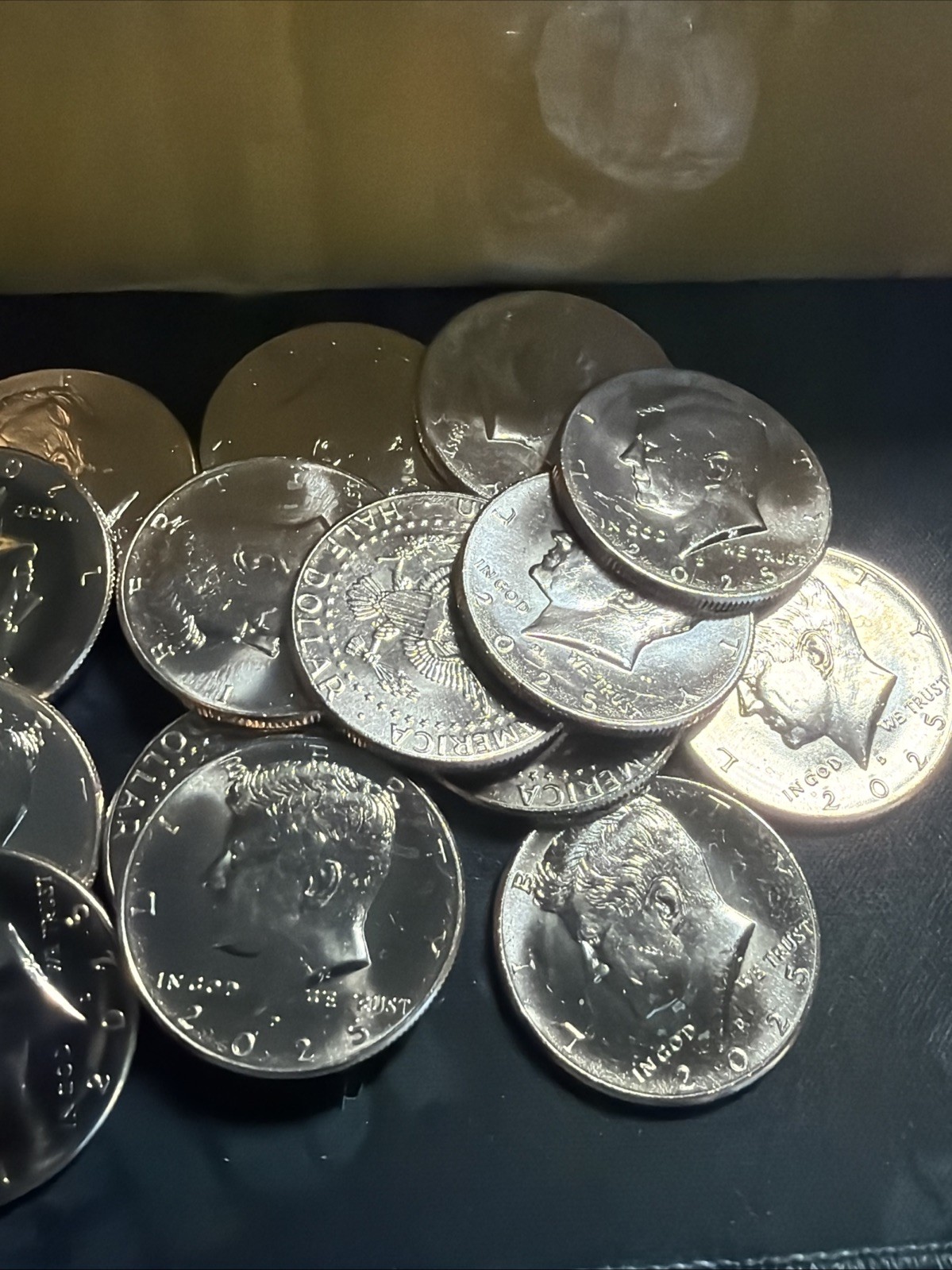 The product is a roll of 2025-D Kennedy Half Dollar coins from the Denver Mint. These uncirculated coins are composed of copper-nickel and bear the image of President John F. Kennedy on the obverse. They are business strike, ungraded, and uncertified, making them ideal for collectors or those looking to add to their coin collection. With free shipping included, this offer is a convenient way to acquire these United States coins.Bidding on 1 roll. These are business strike coins that can contain your typical mark, ding, and or spot. I checked a couple rolls and have no reason to believe that they are not all 2025 D Kennedy halves. These are in uncirculated condition. These are head/tails, head/head, and tail/tail Enders. Free shipping