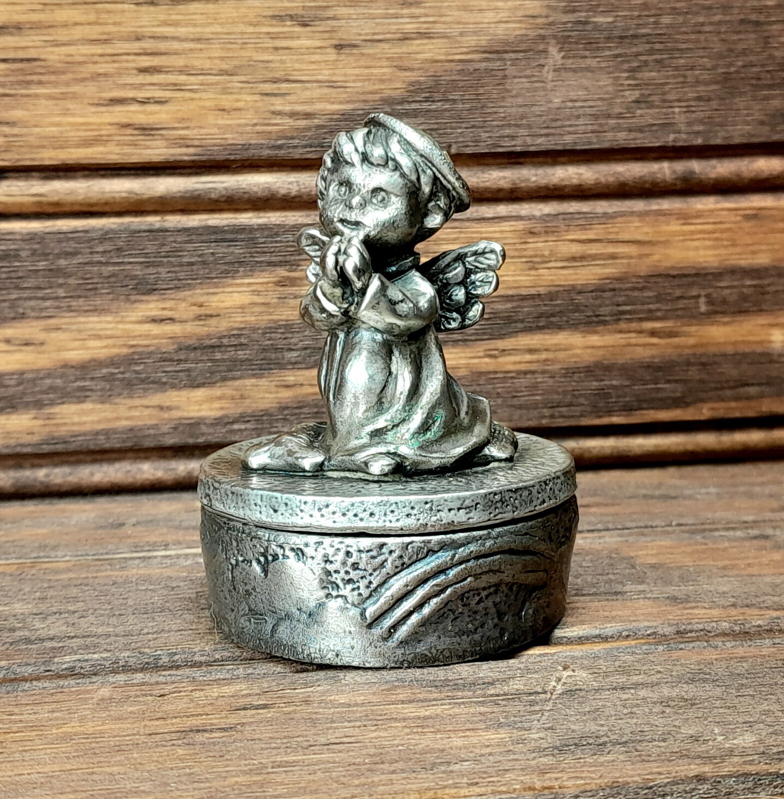 Vtg Pewter Praying Angel Boy Figurine Tooth / Jewel / Ring Box 2.25” Collectible