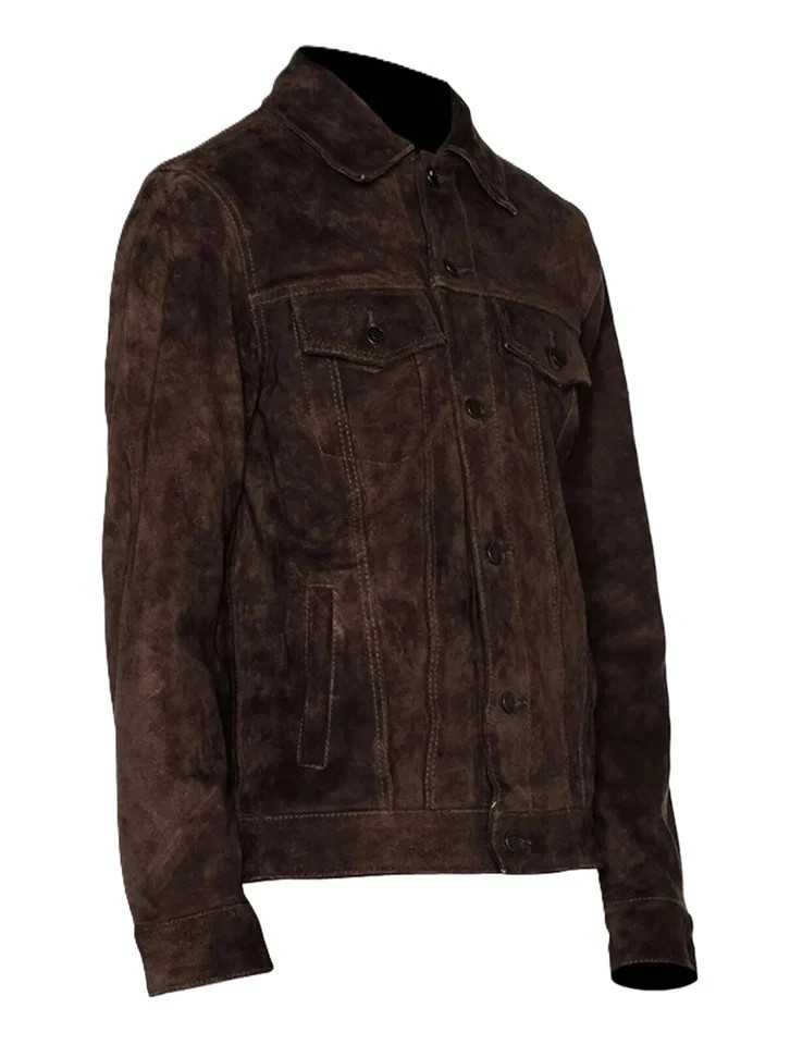 Men's Real Suede Leather Dark Brown Trucker Jacket Denim Style Classic Jacket