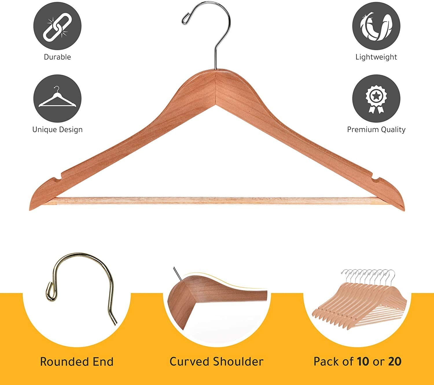 Why Choose Our Wooden Clothes Hanger Set? Here Are The Top 3 Reasons! ✅ UPGRADED CONTOURED SHOULDER DESIGN: Unlike standard coat or jacket hangers that cause your clothes to slip or , these suit hangers for men with the slightly curved design imitate the human shoulder curvature and prevent creasing for your coats and shirts. ✅ CONVENIENT 360-DEGREE SWIVEL HOOKS: Instead of fumbling in your wardrobe to find the top or pants you need, you can now browse your clothes with ease. The sturdy rotating hooks help you find your clothes faster without removing them from the hanger. ✅ SLEEK DESIGN IN 5 COOL COLORS: These luxurious wood clothes hangers with the amazing gloss finish are available in 5 different colors. Order yours today and more set as a thoughtful gift! Need More Reasons? ✔ Offered in 10-Pack, 20-Pack, 80-Pack Set or 90 pack sets ✔ Heavy-Duty Lotus Wood – Durable Rust-stylish Hooks ✔ Great For Bedroom, Nursery, Guest Room, Hotel What You : 1 * Set of Wooden Hangers 10-Pack, 20-Pack 80 Pack, or 90 pack Your Premium Hangers Today!✅ UPGRADED CONTOURED SHOULDER DESIGN: The groundbreaking curved shoulder design of our clothing hangers helps your coats or suits maintain their form while hanging neatly in your bedroom closet.✅ ORGANIZE YOUR CLOSET with this premium set of wood cloth hangers with 360-degree rotating hooks, which will keep all your shirts, dresses, jackets, suits, pants, blouses and coats crease-.✅ ADD STYLE WITH OUR UNIQUE ROUND-ENDING HOOK: The elegant round ending hooks make our wood coat hangers uniquely elegant. Choose yours in a set of 10, 20, or 80 and brighten your bedroom closet, guest room closet or the ' room wardrobe.✅ USE THESE STRONG HANGERS FOR YEARS: Made of thick, high-Lotus wood, these wooden coat hangers are much sturdier than cedar, or plastic cloth hangers. Hang heavy coats and jackets -!✅ SELECT YOUR HANGERS IN A MODERN COLOR: We offer you these non-slip real wood hangers in 5 different colors. Choose your set in the