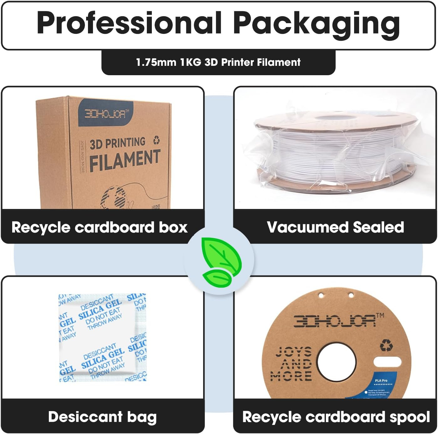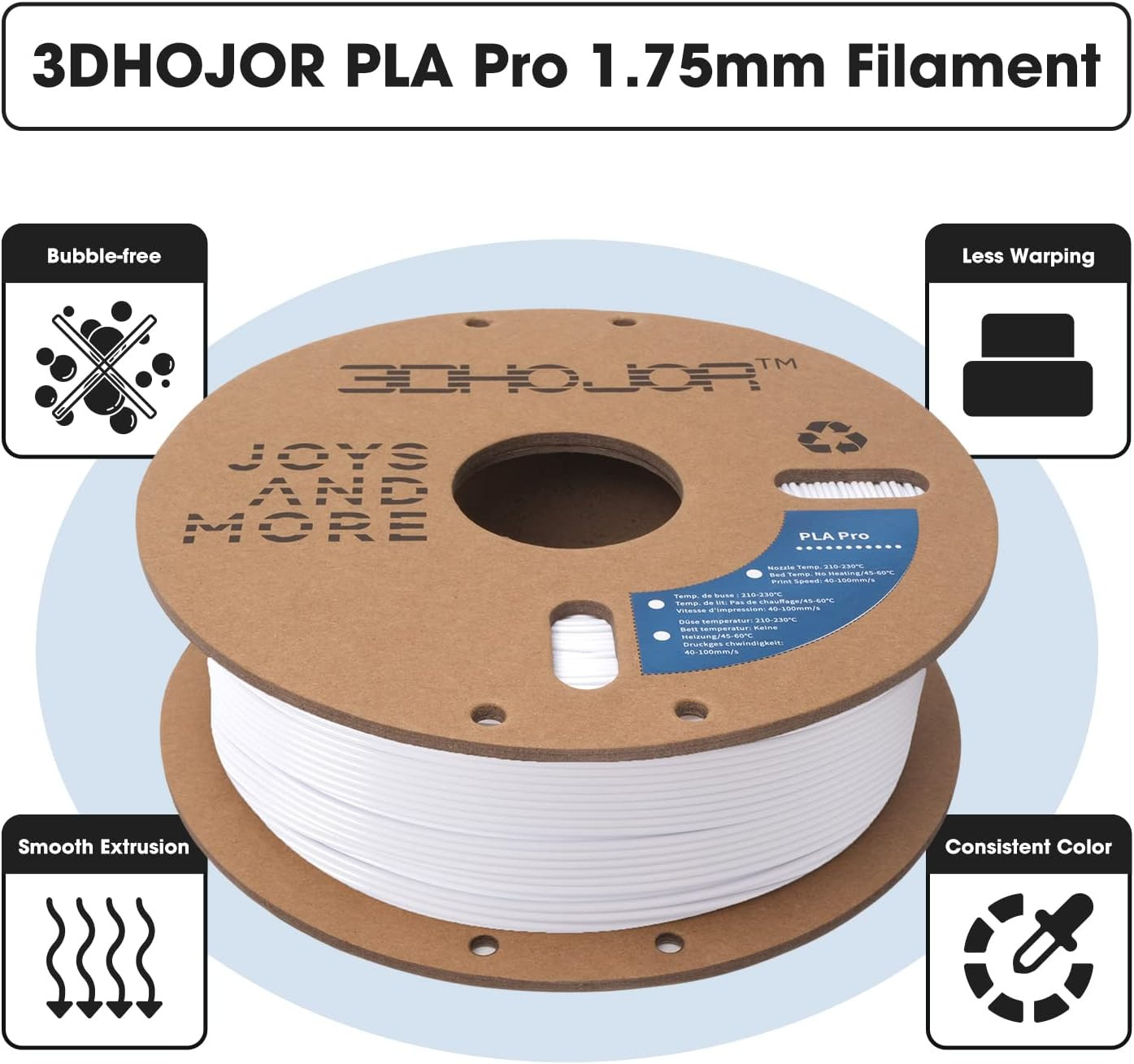 【Clog-free & Less-tangle】Full mechanical winding and strict manual examination to avoid any tangling issues.No overlap or tangle, no clogging and no cracking, printing models that have smooth and stable surface finish.【Higher strength and better toughness】Compare with PLA, it has higher strength and better toughness.High Purity & High Precision. Low Shrinkage & Strong Layer Adhesion.【Environmentally Friendly】Extracted and purified from corn grain and harmless to the human body. Low Odor and Non-toxic ; 3DHoJor PLA Pro 1.75mm Filament with Recycle carboard Spool.【High Compatibility】Compatible with Most of FDM 3D Printers, such as: Bamboo Lab X1/X1C Creality K1 /K1 MAX, AnkerMake M5, Voron 2.4, FLSUN V400, Prusa, UltiMaker, MK3, MakerBot, Flashforge, Raise3D,Creality Ender 3 and Ender 3 Pro, Anycubic Mega Pro and more. PLA Pro filament extrusion / Nozzle temperature 210℃-230℃(Recommended Temperature 215℃), bed 45℃-60℃.【Vacuumed Sealed Packaging】Comes in a sealed vacuum bag with a desiccant bag to keep it dry and prevent from dust and foreign particles, no bubble and easy to print. Product description