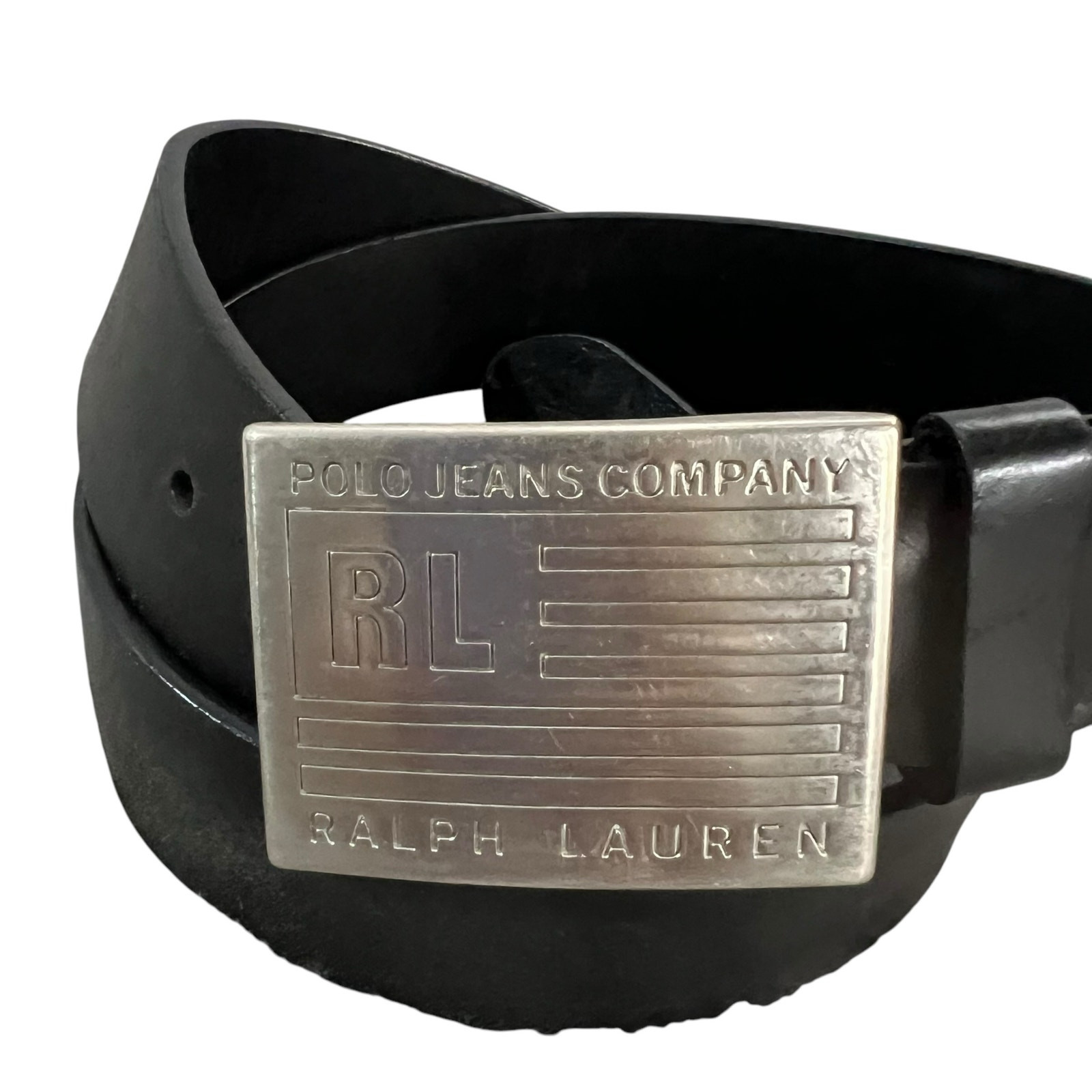 POLO RALPH LAUREN JEANS CO. Vintage Silver Buckle designed like a flagBlack Leather Belt 42"Branding on back side has worn off - hard to photographPre-owned vintage great condition