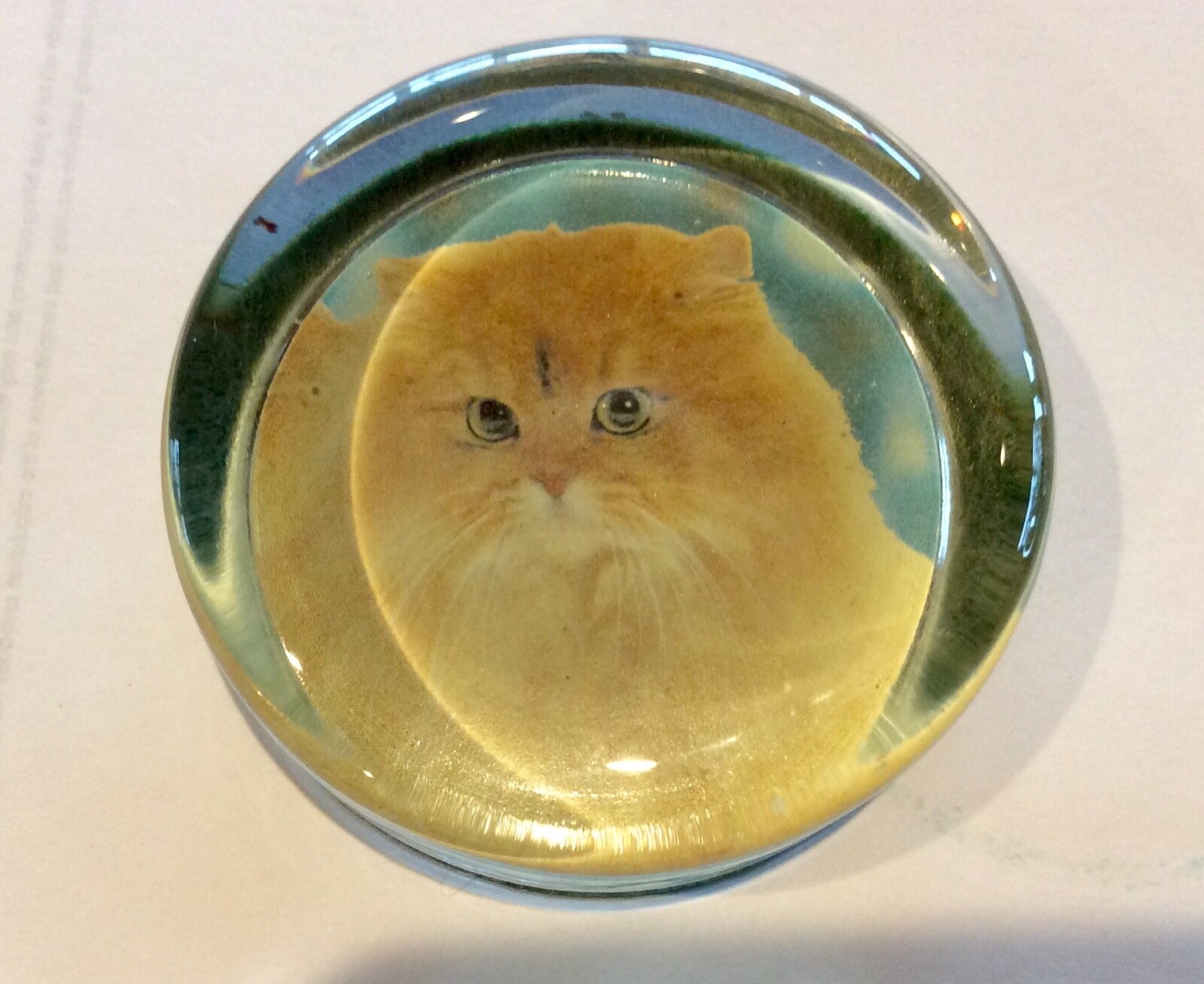 VINTAGE Glass Cat Picture Paperweight Round Heavy 2 & 1/2” Specs