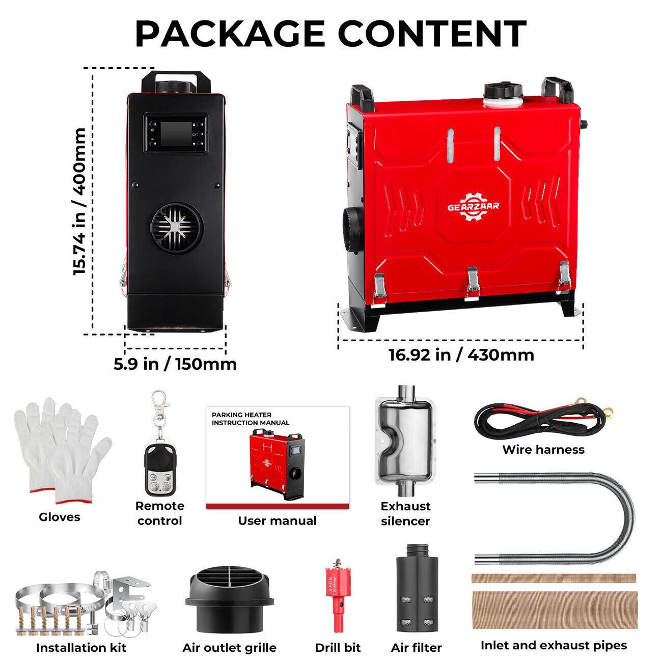 Brand New* Heater Power : 5-8 KW* Fuel: Diesel (5L)* Voltage: 12V ~ 24V* Color: Black + Red* Material: Metal & ABS Plastic* Car Air Conditioning Type: Heating* Switch Type: LCD Switch* Rotated Speed: 4000(r/m)* Remote Control Distance: 100m(Without Obstacle)* Radiator Working Temperature: -40℃~+50℃* Operating Temperature of the Oil Pump: -40℃~+40℃ Packaged included:1 x Parking heater1 x 12v-24V cable harness2 x fixed gaskets (for fixing exhaust pipes)1 x Silencer1 x muffler tailpipe1 x L-shaped installation