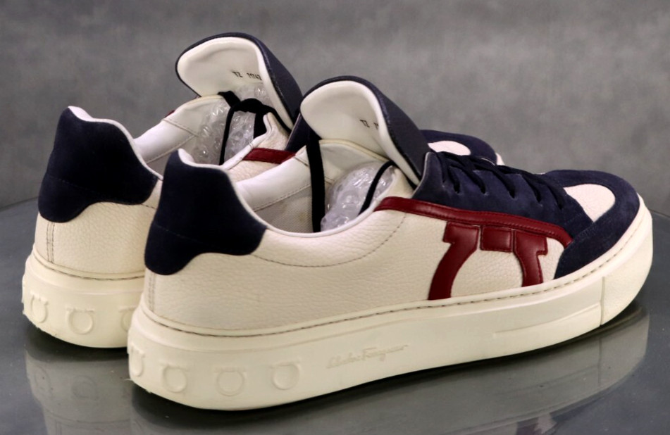 color combination. These sneakers feature the iconic Gancini logo, subtly embossed for a refined yet recognizable touch. Made with precision in Italy, they reflect the brand's commitment to high-quality craftsmanship and timeless design. The low-top silhouette and durable rubber sole provide both style and comfort for everyday wear.Condition:Very good condition. May have minor marks as seen in pictures. Plenty of life on uppers and soles. See detailed photos. Inv # 0415 05-04-25