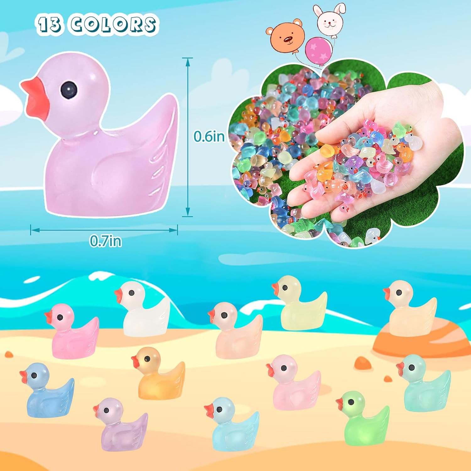 Store New Arrivals Add to Favorite View Feedback Contact 260PCS Mini Tiny Resin Ducks Little Miniature Plastic Small Ducks Bulk Glow Description Number of Items 260 Product Dimensions 0.7 x 0.6 x 0.4 inches Item Weight 11.3 ounces Manufacturer recommended age 3 years and up Package Includes: You will get 260 pieces of bulk little resin ducks, 13 colors,20 pieces of each color,enough quantity to meet your diverse needs.Size materials: Mini