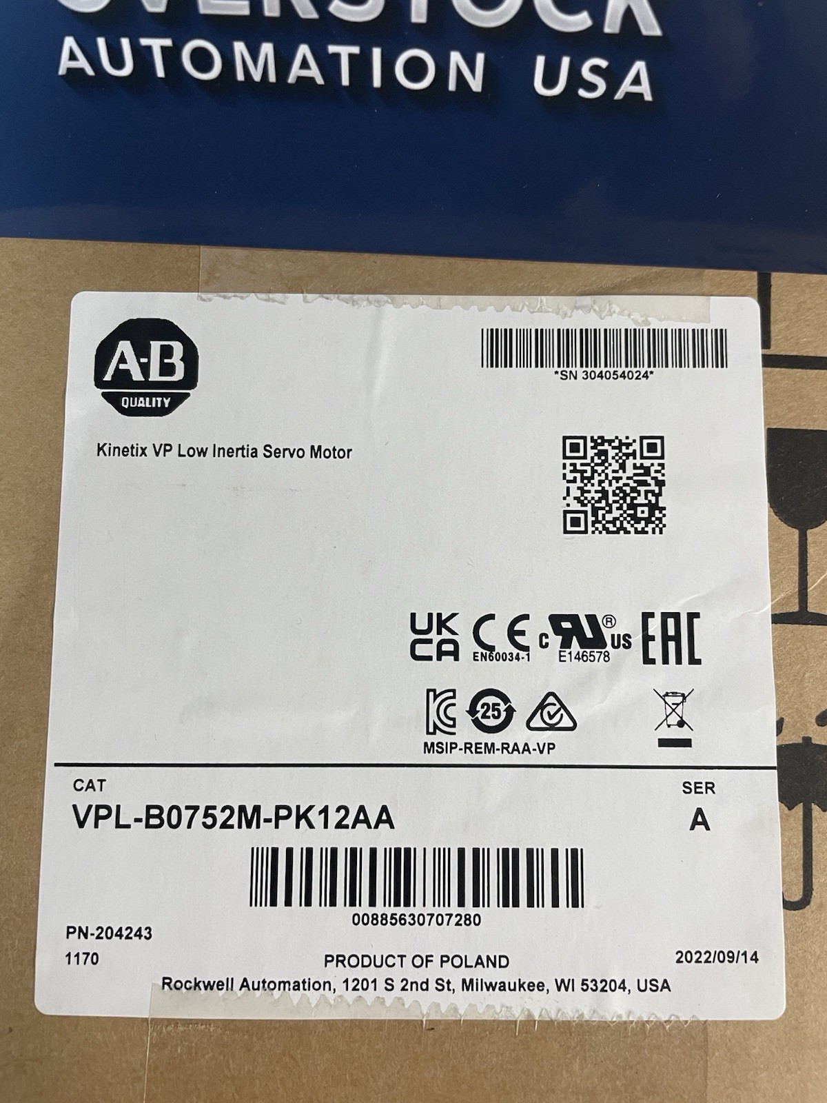 NEW AB VPL-B0752M-PK12AA Allen Bradley Kinetix VP Low Intertia Servo Motor Specs