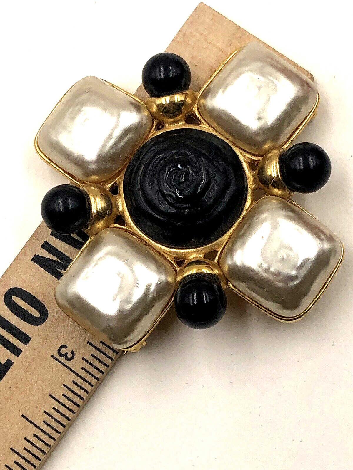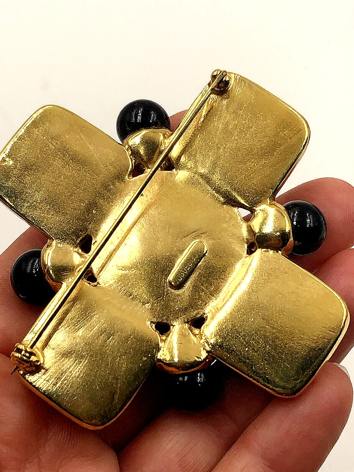 STUNNING and VERY RARE, VINTAGE "VOGUE BIJOUX" SIGNED, BROOCH IN SHAPE OF MALTESE CROSS with amazing BAROQUE FAUX square Gripoix PEARLS and BLACK CENTERSTONE in Gripoix poured jet glass. -- GREAT FOR ANY OCCASION - WEAR IT ON YOUR LAPEL, COAT, BLAZER, JACKET, DRESS, CARDIGAN, SWEATER, SHIRT, HAT, PURSE, OR SCARF!My pictures are enlarged to show quality, condition and details. It is about 2.75" in diameter. I encourage you to review every photo provided, since my pictures are an essential part of the description. Please ask your questions prior to bidding / purchasing. Returns are not accepted.I'll gift wrap for you and will package it very well, however, my display boxes are not for sale.Please Note: - The Items, which I List, are Antique, Vintage or Old, (they are NOT