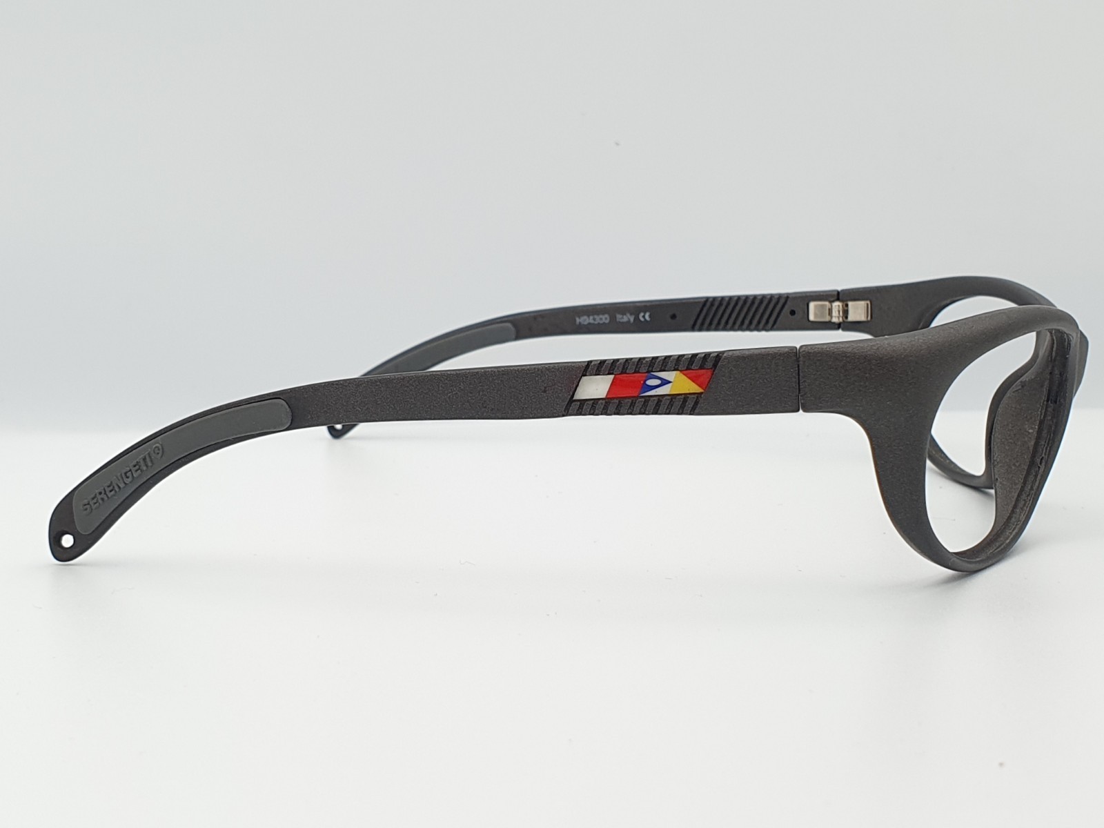 Serengeti Sunglasses.Model H94300.CIrca 2000's.A Purpose Made Lightweight Composite Plastic Oval Rectangular Wrap Frame with Proportionally Medium Profile Temples Incorporating Flexible Temple Sides and Nautical Flag Motifs. Finished in Grey and Purpose Made for the Yachting World. Made in Italy.From a Private Collection.In Well Preserved Original Condition.Frame is in Well Preserved Original Condition with Signs of General Wear and Age Related Deterioration.Please Examine the Pictures.Please Email with Any Questions.No Original Packaging but Will Be Sent in a Suitable Case.Domestic Delivery is Next Day.