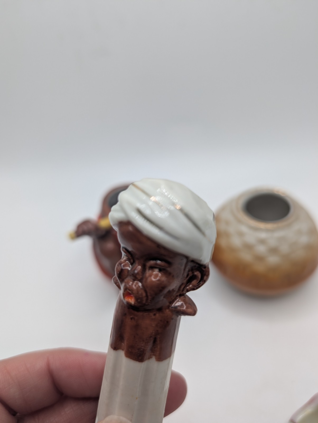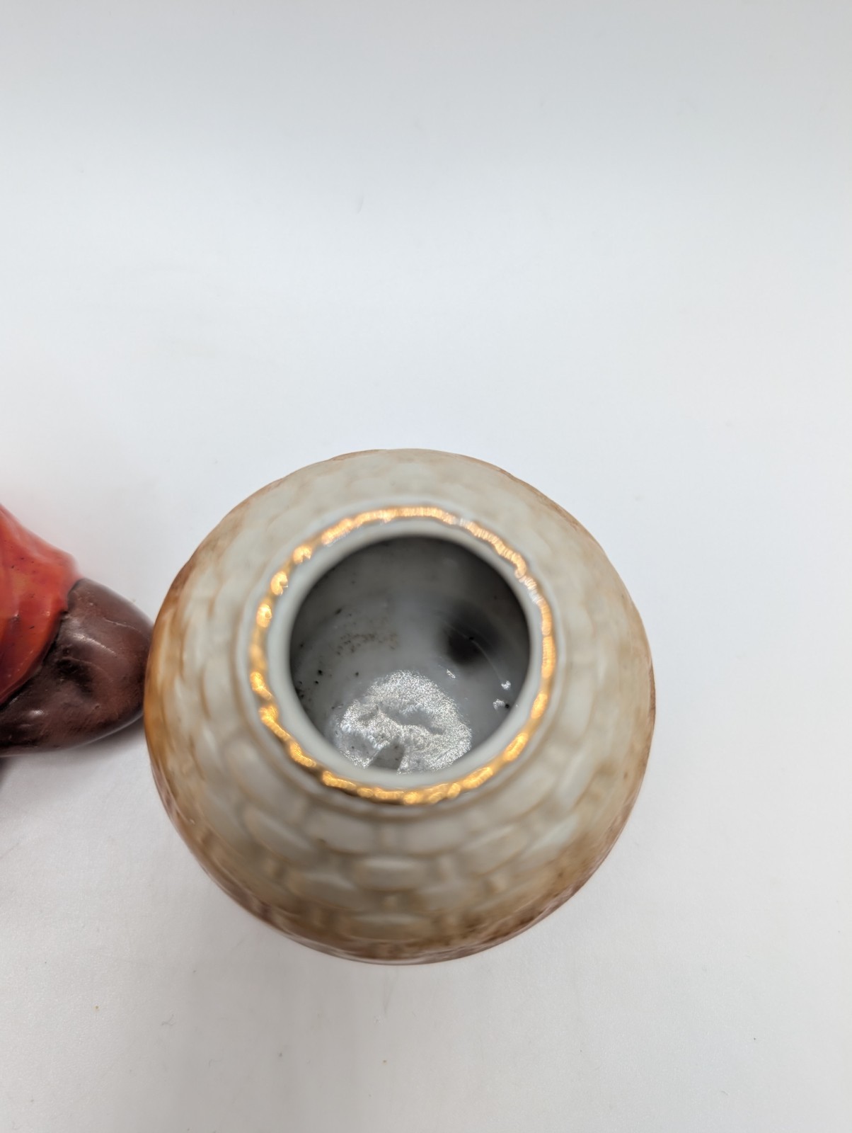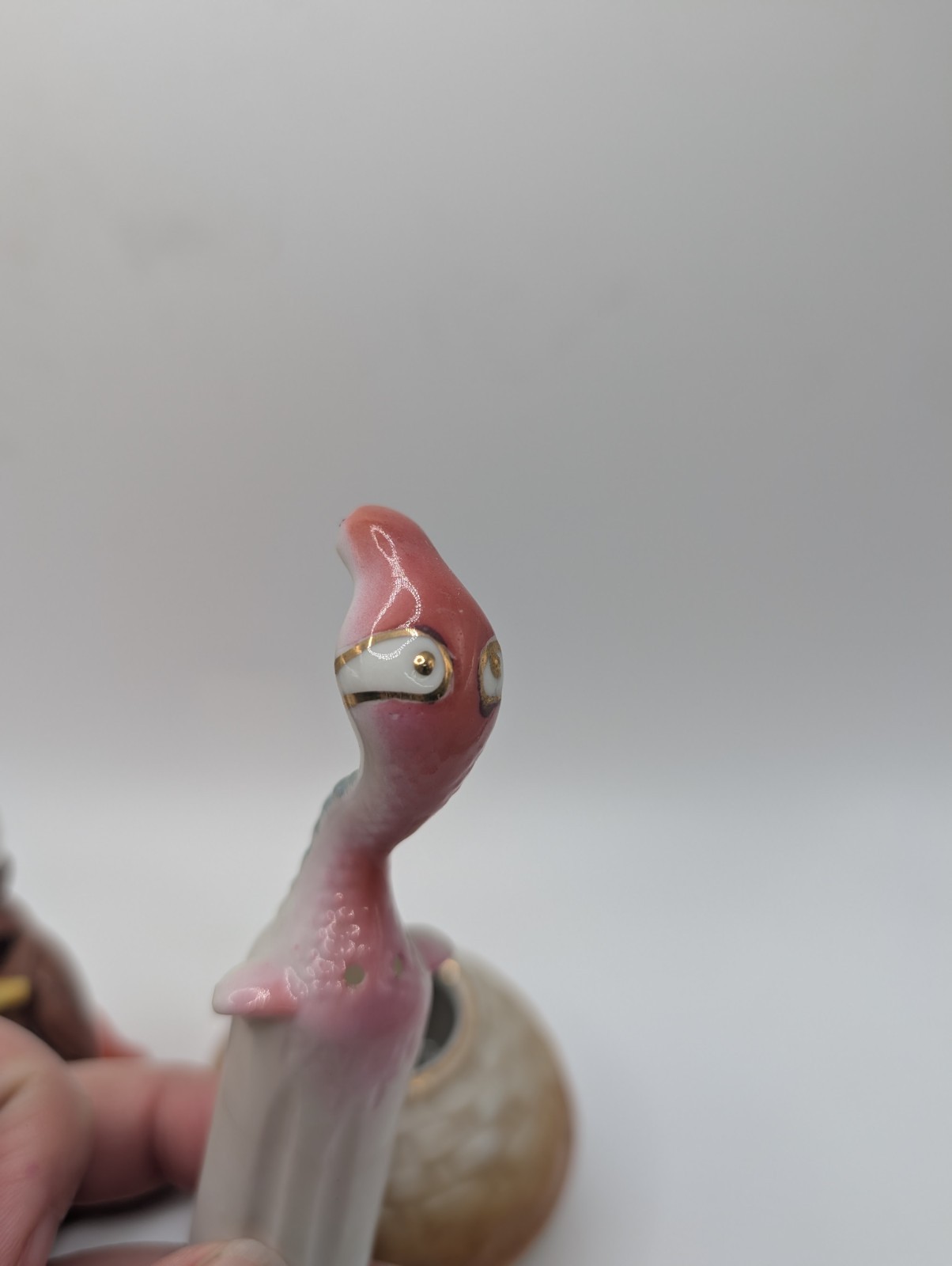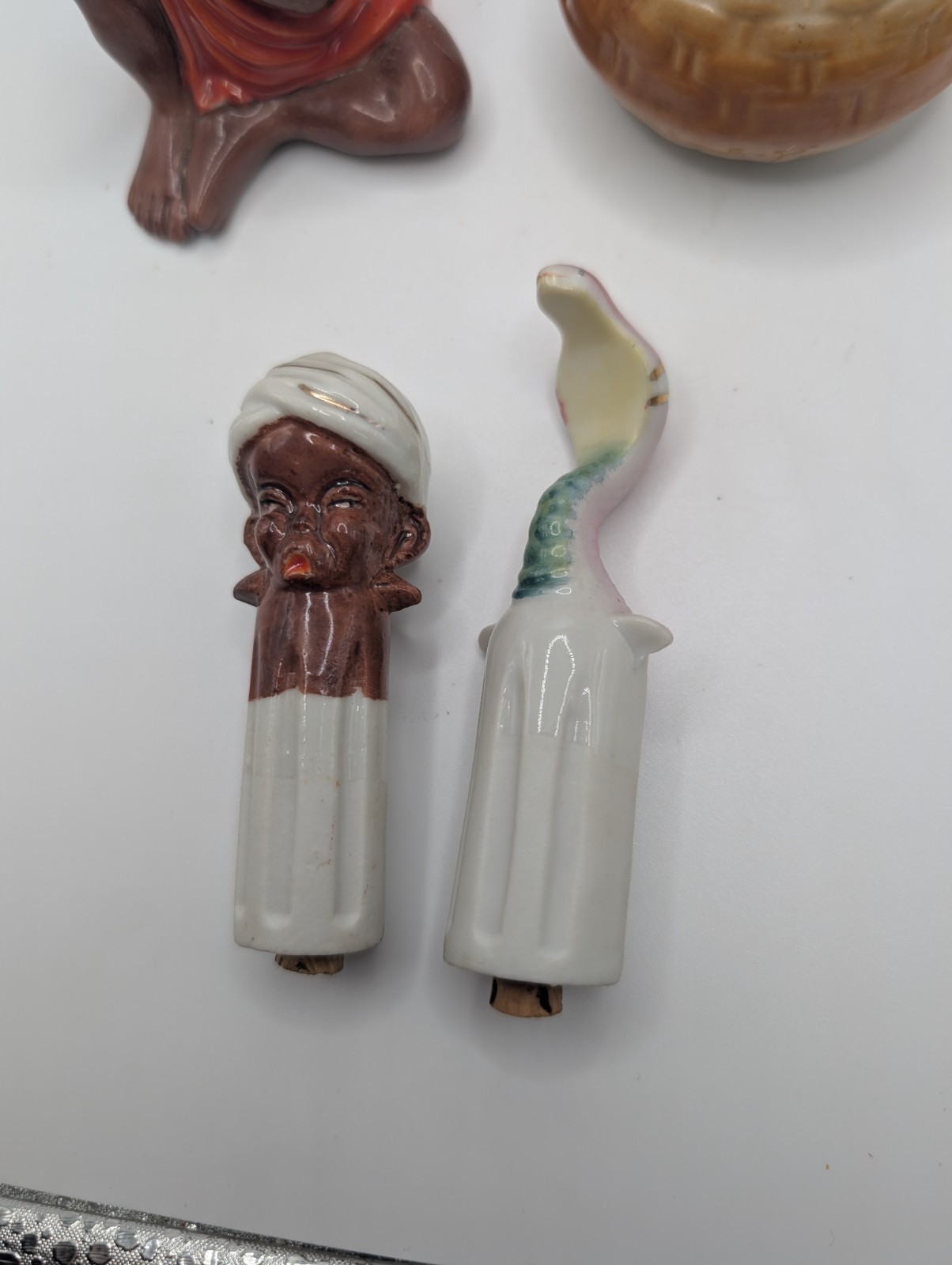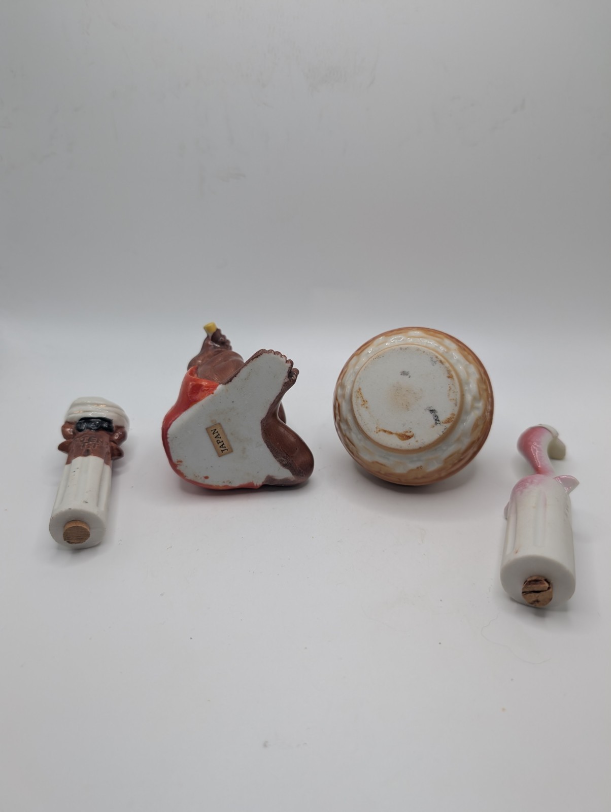 I inherited my grandma's massive salt and pepper shaker collection and want to pass these along to new homes with people who will love and appreciate them. These shakers are a unique and wonderful find! These shakers are composed of a snake charmer and Cobra coming out of a basket. With the design of these "nodding" or "bobble head" like pieces, the head of the snake charmer and the snake can rock back and forth. The back of the neck of the charmer and on the snakes body (in the basket) is engraving that says "Patent T.T". There are no chips or cracks in the ceramic of the pieces. There is some light scuffing on the basket. They show light signs of wear. The inside of the body and basket are a little bit dirty but that could clean up. There is gold detailing in the snakes back pattern, the rim of the snakes basket, and the snake charmer's turban. I did my best to include photos. See images for full condition. The shakers both contain their plugs. When assembled, the snake and basket are approximately just under 4 inches tall.Feel free to check out my other listings, bundle items together, and make an offer! :)