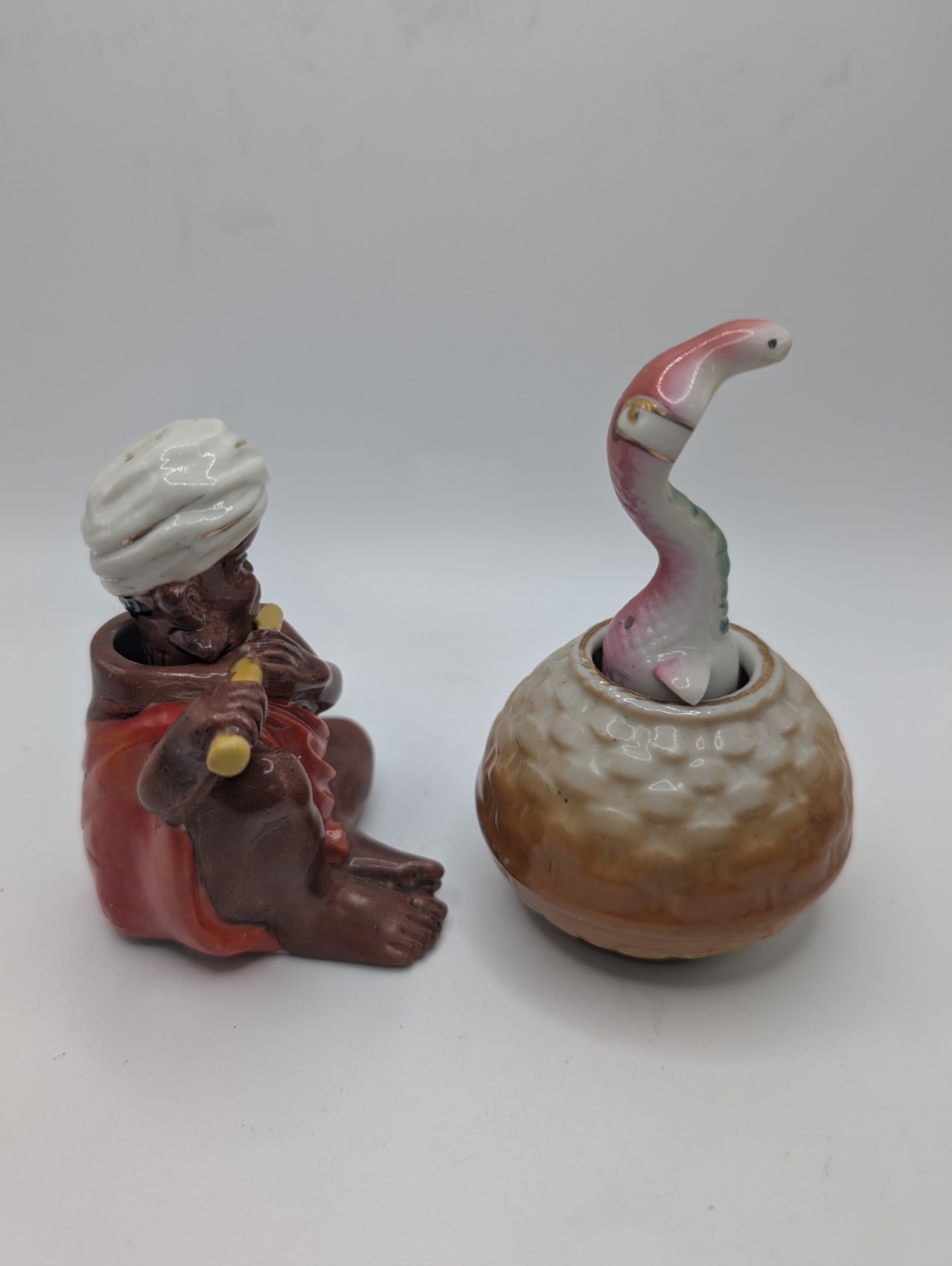 These vintage Snake Charmer and Cobra bobblehead (nodding) salt and pepper shakers are a unique collectible set for display or themed décor. Condition is used; check the listing for details on any wear, markings, or completeness. Free shipping is included, and the item will be packaged for safe transit. If you need confirmation of measurements, materials, or functionality, check the listing for details or request additional photos before purchase.