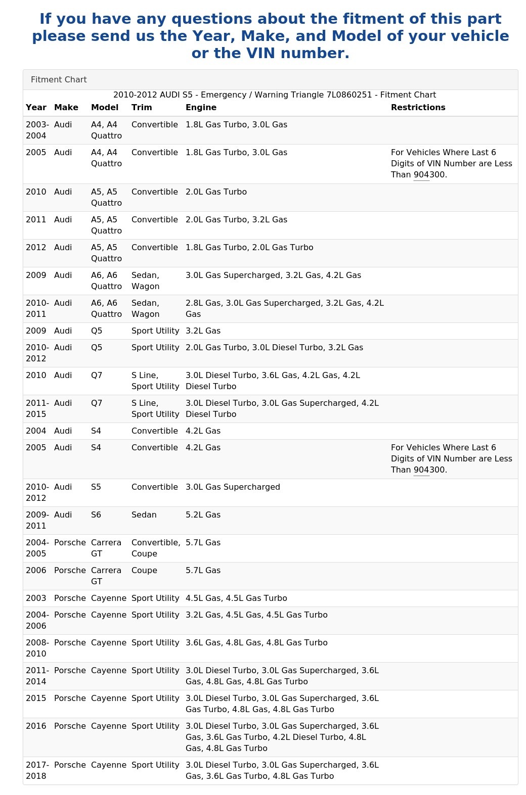 Please click here to view detais.row .part-specs .part-specs dl dl dt dd .part-specs>dl dd .part-specs>dl dd:after .part-specs>dl dt .custom-list-mobile>dl dt 2010-2012 AUDI S5 - Emergency / Warning Triangle 7L0860251DescriptionCondition NotesThis part comes as shown in the picture(s).Part SpecsSKU Number617574BrandPorscheCompatible Part , 8H0860251, 00072272206, 00072272205, 00072272202, 95572172200, 00072272201, 00072272203, 00072272204Fitment Chart @media (max-width: 768px) dl.fit-chart-dl dt dd.fit-chart-restriction-dd } dl dt dd > dl dd > dl dd:after > dl dt Year2003-2004MakeAudiModelA4, A4 QuattroTrimConvertibleEngine1.8L Gas Turbo, 3.0LGasYear2005MakeAudiModelA4, A4 QuattroTrimConvertibleEngine1.8L Gas Turbo, 3.0LGasRestrictionsFor Vehicles Where Last 6 Digits of VIN Number are Less Than 904Film strip, Green300.Year2010MakeAudiModelA5, A5 QuattroTrimConvertibleEngine2.0L Gas TurboYear2011MakeAudiModelA5, A5 QuattroTrimConvertibleEngine2.0L Gas Turbo, 3.2LGasYear2012MakeAudiModelA5, A5 QuattroTrimConvertibleEngine1.8L Gas Turbo, 2.0L Gas TurboYear2009MakeAudiModelA6, A6 QuattroTrimSedan, WagonEngine3.0L Gas Supercharged, 3.2LGas, 4.2LGasYear2010-2011MakeAudiModelA6, A6 QuattroTrimSedan, WagonEngine2.8LGas, 3.0L Gas Supercharged, 3.2LGas, 4.2LGasYear2009MakeAudiModelQ5TrimSport UtilityEngine3.2LGasYear2010-2012MakeAudiModelQ5TrimSport UtilityEngine2.0L Gas Turbo, 3.0L Diesel Turbo, 3.2LGasYear2010MakeAudiModelQ7TrimS Line, Sport UtilityEngine3.0L Diesel Turbo, 3.6LGas, 4.2LGas, 4.2L Diesel TurboYear2011-2015MakeAudiModelQ7TrimS Line, Sport UtilityEngine3.0L Diesel Turbo, 3.0L Gas Supercharged, 4.2L Diesel TurboYear2004MakeAudiModelS4TrimConvertibleEngine4.2LGasYear2005MakeAudiModelS4TrimConvertibleEngine4.2LGasRestrictionsFor Vehicles Where Last 6 Digits of VIN Number are Less Than 904Film strip, Green300.Year2010-2012MakeAudiModelS5TrimConvertibleEngine3.0L Gas SuperchargedYear2009-2011MakeAudiModelS6TrimSedanEngine5.2LGasYear2004-2005MakePorscheModelCarrera GTTrimConvertible, CoupeEngine5.7LGasYear2006MakePorscheModelCarrera GTTrimCoupeEngine5.7LGasYear2003MakePorscheModelCayenneTrimSport UtilityEngine4.5LGas, 4.5L Gas TurboYear2004-2006MakePorscheModelCayenneTrimSport UtilityEngine3.2LGas, 4.5LGas, 4.5L Gas TurboYear2008-2010MakePorscheModelCayenneTrimSport UtilityEngine3.6LGas, 4.8LGas, 4.8L Gas TurboYear2011-2014MakePorscheModelCayenneTrimSport UtilityEngine3.0L Diesel Turbo, 3.0L Gas Supercharged, 3.6LGas, 4.8LGas, 4.8L Gas TurboYear2015MakePorscheModelCayenneTrimSport UtilityEngine3.0L Diesel Turbo, 3.0L Gas Supercharged, 3.6L Gas Turbo, 4.8LGas, 4.8L Gas TurboYear2016MakePorscheModelCayenneTrimSport UtilityEngine3.0L Diesel Turbo, 3.0L Gas Supercharged, 3.6LGas, 3.6L Gas Turbo, 4.2L Diesel Turbo, 4.8LGas, 4.8L Gas TurboYear2017-2018MakePorscheModelCayenneTrimSport UtilityEngine3.0L Diesel Turbo, 3.0L Gas Supercharged, 3.6LGas, 3.6L Gas Turbo, 4.8L Gas Turbo 2010-2012 AUDI S5 - Emergency / Warning Triangle 7L0860251 - Fitment Chart Year Make Model Trim Engine Restrictions 2003-2004AudiA4, A4 QuattroConvertible1.8L Gas Turbo, 3.0LGas2005AudiA4, A4 QuattroConvertible1.8L Gas Turbo, 3.0LGasFor Vehicles Where Last 6 Digits of VIN Number are Less Than 904Film strip, Green300.2010AudiA5, A5 QuattroConvertible2.0L Gas Turbo2011AudiA5, A5 QuattroConvertible2.0L Gas Turbo, 3.2LGas2012AudiA5, A5 QuattroConvertible1.8L Gas Turbo, 2.0L Gas Turbo2009AudiA6, A6 QuattroSedan, Wagon3.0L Gas Supercharged, 3.2LGas, 4.2LGas2010-2011AudiA6, A6 QuattroSedan, Wagon2.8LGas, 3.0L Gas Supercharged, 3.2LGas, 4.2LGas2009AudiQ5Sport Utility3.2LGas2010-2012AudiQ5Sport Utility2.0L Gas Turbo, 3.0L Diesel Turbo, 3.2LGas2010AudiQ7S Line, Sport Utility3.0L Diesel Turbo, 3.6LGas, 4.2LGas, 4.2L Diesel Turbo2011-2015AudiQ7S Line, Sport Utility3.0L Diesel Turbo, 3.0L Gas Supercharged, 4.2L Diesel Turbo2004AudiS4Convertible4.2LGas2005AudiS4Convertible4.2LGasFor Vehicles Where Last 6 Digits of VIN Number are Less Than 904Film strip, Green300.2010-2012AudiS5Convertible3.0L Gas Supercharged2009-2011AudiS6Sedan5.2LGas2004-2005PorscheCarrera GTConvertible, Coupe5.7LGas2006PorscheCarrera GTCoupe5.7LGas2003PorscheCayenneSport Utility4.5LGas, 4.5L Gas Turbo2004-2006PorscheCayenneSport Utility3.2LGas, 4.5LGas, 4.5L Gas Turbo2008-2010PorscheCayenneSport Utility3.6LGas, 4.8LGas, 4.8L Gas Turbo2011-2014PorscheCayenneSport Utility3.0L Diesel Turbo, 3.0L Gas Supercharged, 3.6LGas, 4.8LGas, 4.8L Gas Turbo2015PorscheCayenneSport Utility3.0L Diesel Turbo, 3.0L Gas Supercharged, 3.6L Gas Turbo, 4.8LGas, 4.8L Gas Turbo2016PorscheCayenneSport Utility3.0L Diesel Turbo, 3.0L Gas Supercharged, 3.6LGas, 3.6L Gas Turbo, 4.2L Diesel Turbo, 4.8LGas, 4.8L Gas Turbo2017-2018PorscheCayenneSport Utility3.0L Diesel Turbo, 3.0L Gas Supercharged, 3.6LGas, 3.6L Gas Turbo, 4.8L Gas Turbo Why BuyWhy BuyGenuine OEM PartsAll the parts we sell are OEM. *Unless otherwise stated.Top RatedWe have been around since 2010 and have amassed tens of thousands of positive feedback in that time.30-Day Return PolicyAll parts purchased through us comes with a 30-day money back guarantee. *Unless otherwise stated.Free ShippingParts shipped within the continental U.S are eligible for Free Shipping. *Unless otherwise stated.Same Day ShippingWe'll ship your part(s) out the same day if you order them by 12:00 PM (Central Standard Time).Indoor StorageAll parts are stored indoors and away from the outdoor elements.Cleaned & TestedOur parts are cleaned and tested, ensuring you're getting a quality part every time.Large InventoryWe have over 100 thousand Audi, Volkswagen & Porsche parts in-stock and ready to ship.DisclaimerDisclaimerMechanical PartsMost all of our parts are Recycled / Used. All of our parts are found to be in good working condition before they are listed for sale (Unless stated otherwise). All of our parts are stored indoors.Interior / Exterior / Cosmetic PartsMost of our parts listed are in good condition (unless stated otherwise) but please keep in mind th