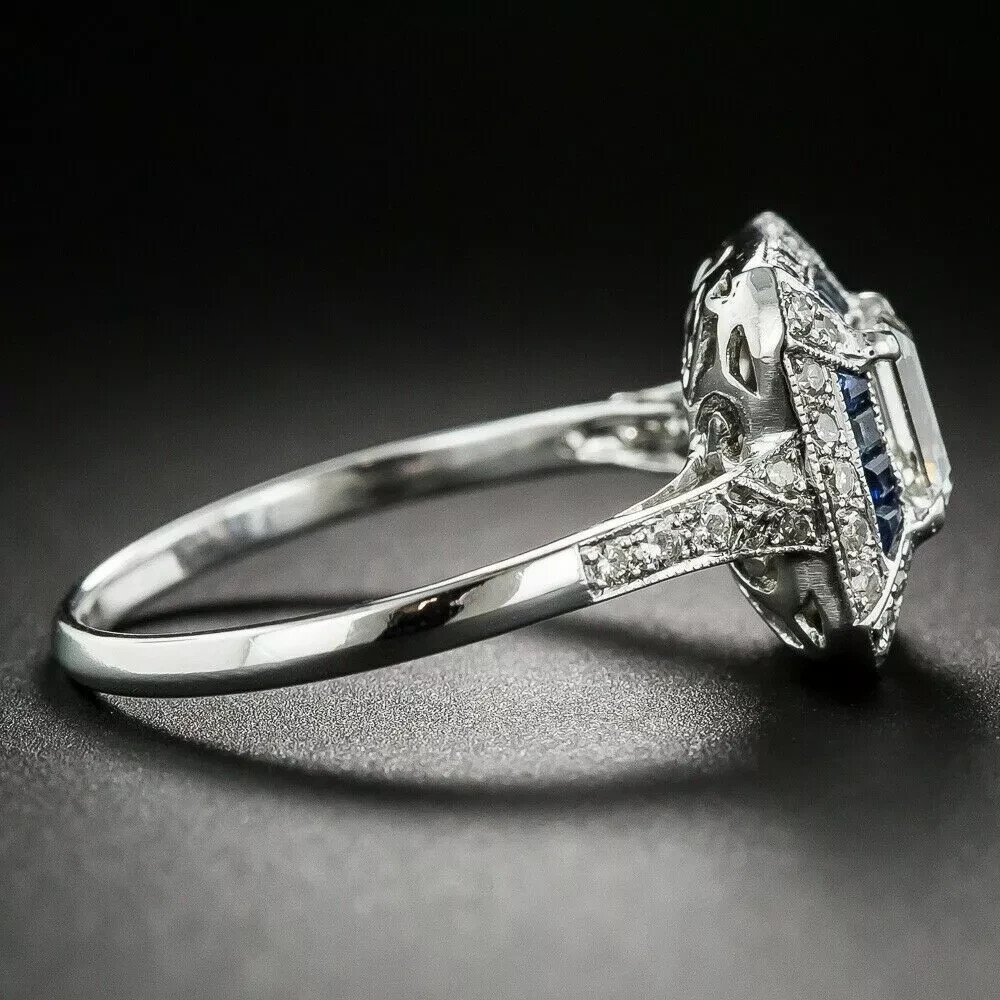 Art Deco Style Emerald Lab-Created Diamond Engagement Ring 14k White Gold Finish