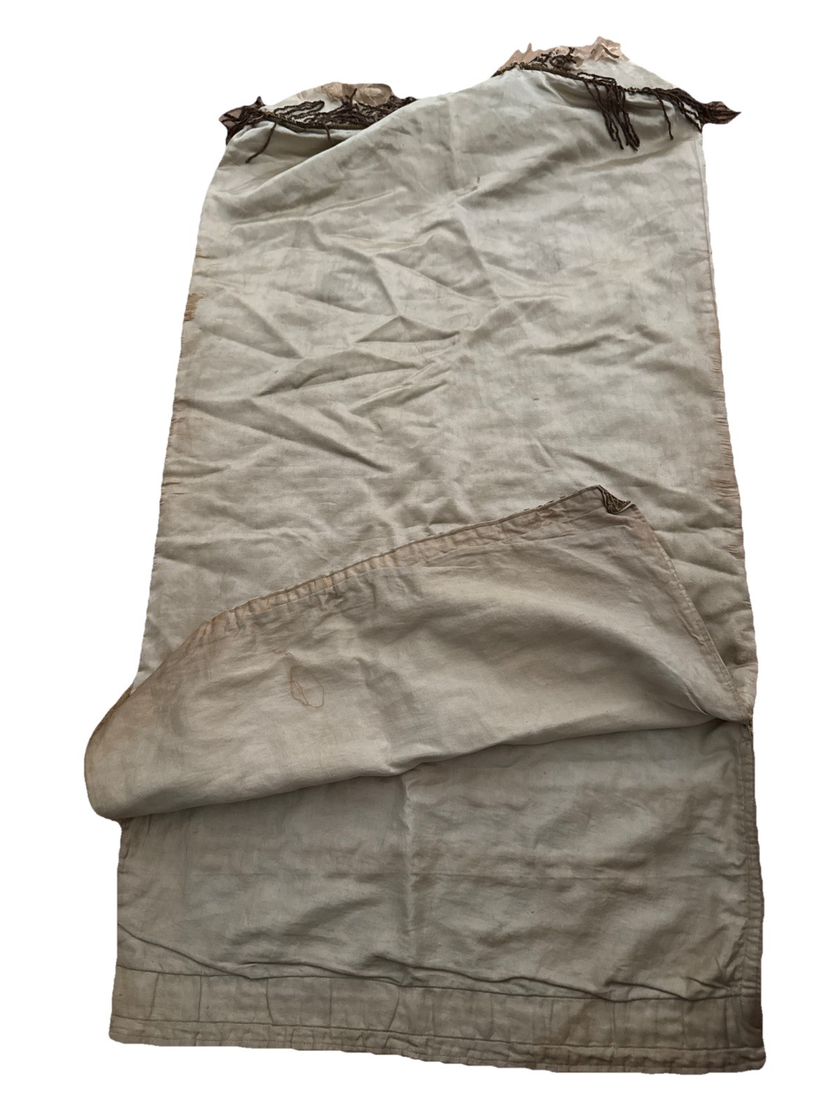 I don’t have any information on this piece other than it is a very old textile with beautiful embroidery, gold fringe, and rhinestones. There is damage to the silk satin in places especially at the top. It measures 16” across the top and 28” in length.