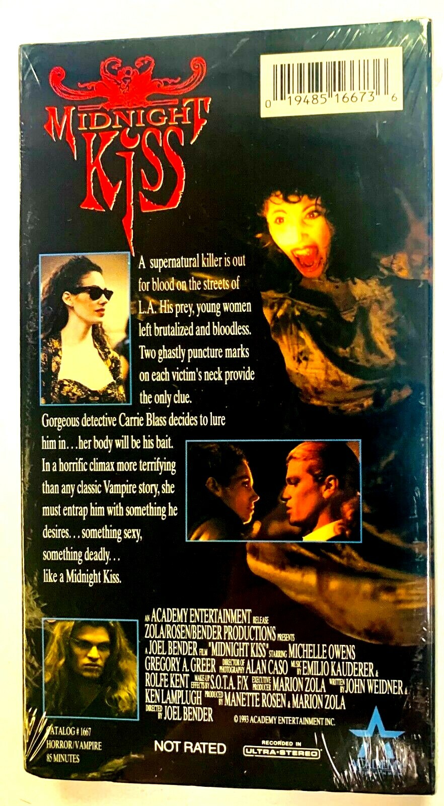 Midnight Kiss (VHS, 1993) - Michelle Owens, Gregory Greer NEW SEALED VERY RAREACADEMY HOME ENTERTAINMENT HORRO VAMPIRE VINTAGE VHS NEW AND ORIGINAL SEALEDPURHASE DIRECT FROM AHE AS ONE OF THEIR DISTRIBUTORS!EXTREMELY RARE TO FIND AT ALL, LET ALONE NEW!APPROX RUNNING TIME 85 MINUTESNEW OLD STOCK. NOT RATED.CATALOG SEE ALL PHOTOSANY QUESTIONS PLEASE ASK