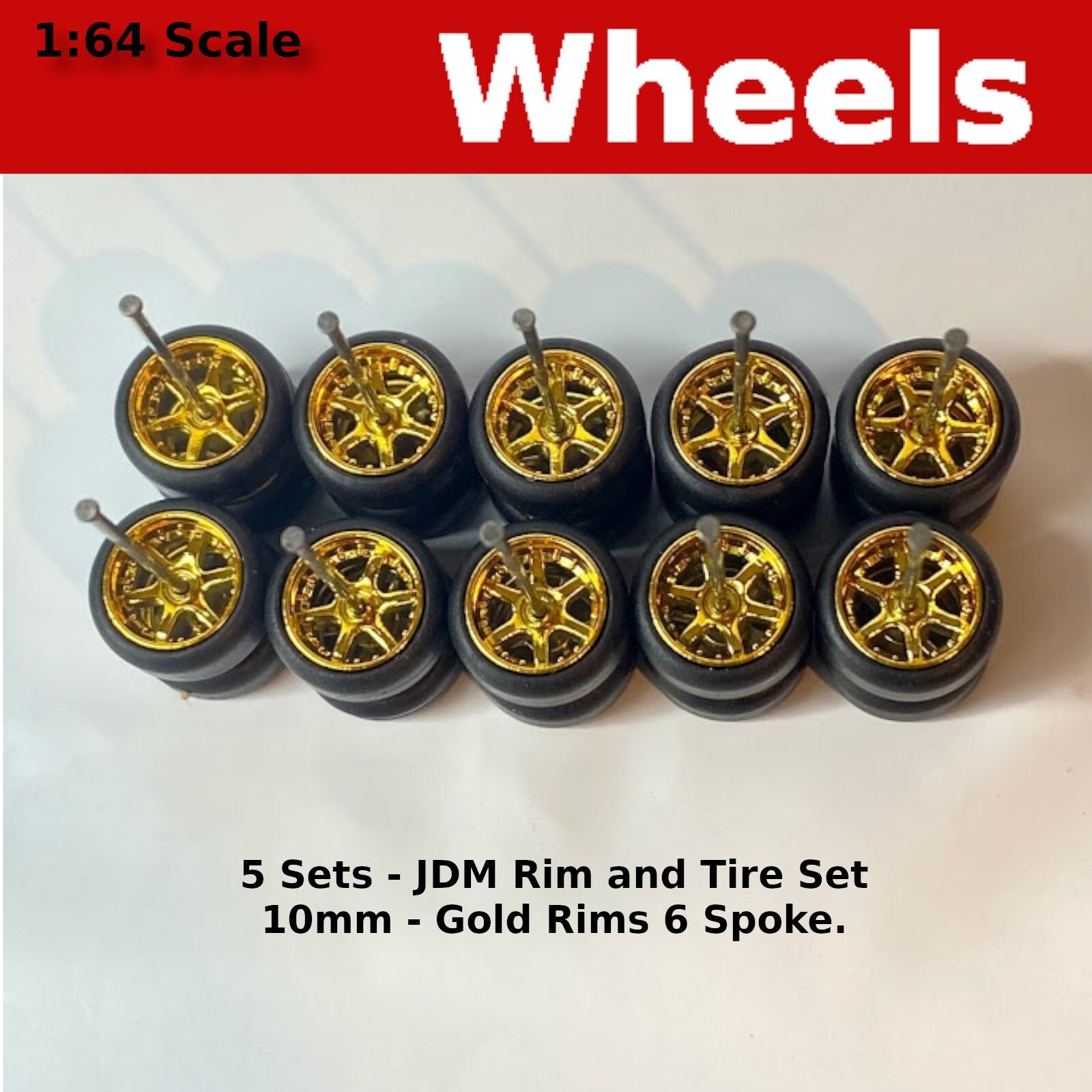 img 5 Sets - Hot Wheels 10mm/10mm JDM Gold rims 6 spoke rubber tire sets. $24.99 Shop 5 Sets - Hot Wheels 10mm/10mm JDM White rims 6 spoke rubber tire sets. $24.99 Shop Hot Wheels 10 RANDOM Real Riders Wheels Rims Tires Set Lot for 1/64 Scale $14.99 Shop 5 Sets - 10mm/10mm ECO JDM Brushed Gold rims 6 spoke rubber tire. Each Set includes: 5 sets of wheels and axles.*20 pieces flow-formed chrome wheels.*20 pieces true-compound rubber tires.*5 pieces industrial grade axles.We strive to provide die-cast enthusiasts with the best aftermarket products. While the designs are inspired by your favorite automotive trends, we make sure to build our products with 100% functionality.Each of the design in our wheel collection is engineered & measured digitally to ensure structural integrity, then produced & colored with industrial precisions, in order to maintain the upmost quality control.The tires that we equip with our wheels are made in rubber compounds with realistic finish & texture; and the universal wheel axles that are included within every set of wheels, are also meticulously forged into the dimension, which are strong enough when under stress but soft enough to be cut & installed.The Wheels have been tested to fit a wide variety of die cast make/model, including but not limited to: Hot Wheels, Matchbox, Tomica, Greenlight, M2, Auto World, Welly, Motormax, etc.Our passion in this hobby drives us to build and create better products, as we continue to support this community that inspired us in the first place. Shipping We ship every day Monday - Friday. Orders in by 9:30 AM EST usually ships same day. Returns We hope you will love your purchase, however if you need to return it, we have a 30 day return policy. Hot Wheels Neon Green 6 spoke Real Riders JDM Classic Wheels for 1/64 Shop $4.99 Hot Wheels Gold 4 spoke Real Riders JDM Classic Wheels and Tires Set for 1/64 Shop $4.99 Hot Wheels 10 RANDOM Real Riders Wheels Rims Tires Set Lot for 1/64 Scale Shop $14.99 Hot Wheels Hot Wheels - Loose p img