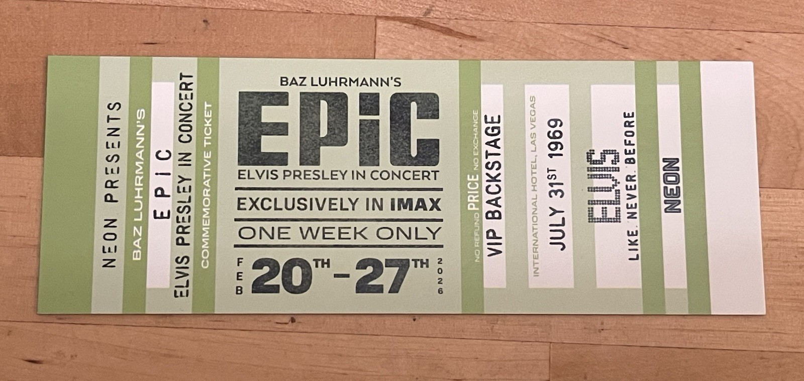 Up for sale is a FULL SET of the OFFICIAL commemorative tickets for the first week IMAX release of EPiC Elvis Presley in Concert, Baz Luhrmann’s fantastic new concert experience/documentary. These were issued by the film’s distributer, Neon, and are very rare. You will receive all 4 tickets in the set!For US buyers, please add $7.50 for shipping in a small box. It will be well packaged with the tickets wrapped in bubble wrap for additional protection.For international shipping, it is through eBay's international shipping service. I have over 25 years on eBay with more than 1000 positive feedbacks, so you can feel assured with your purchase.Please email me with any questions.