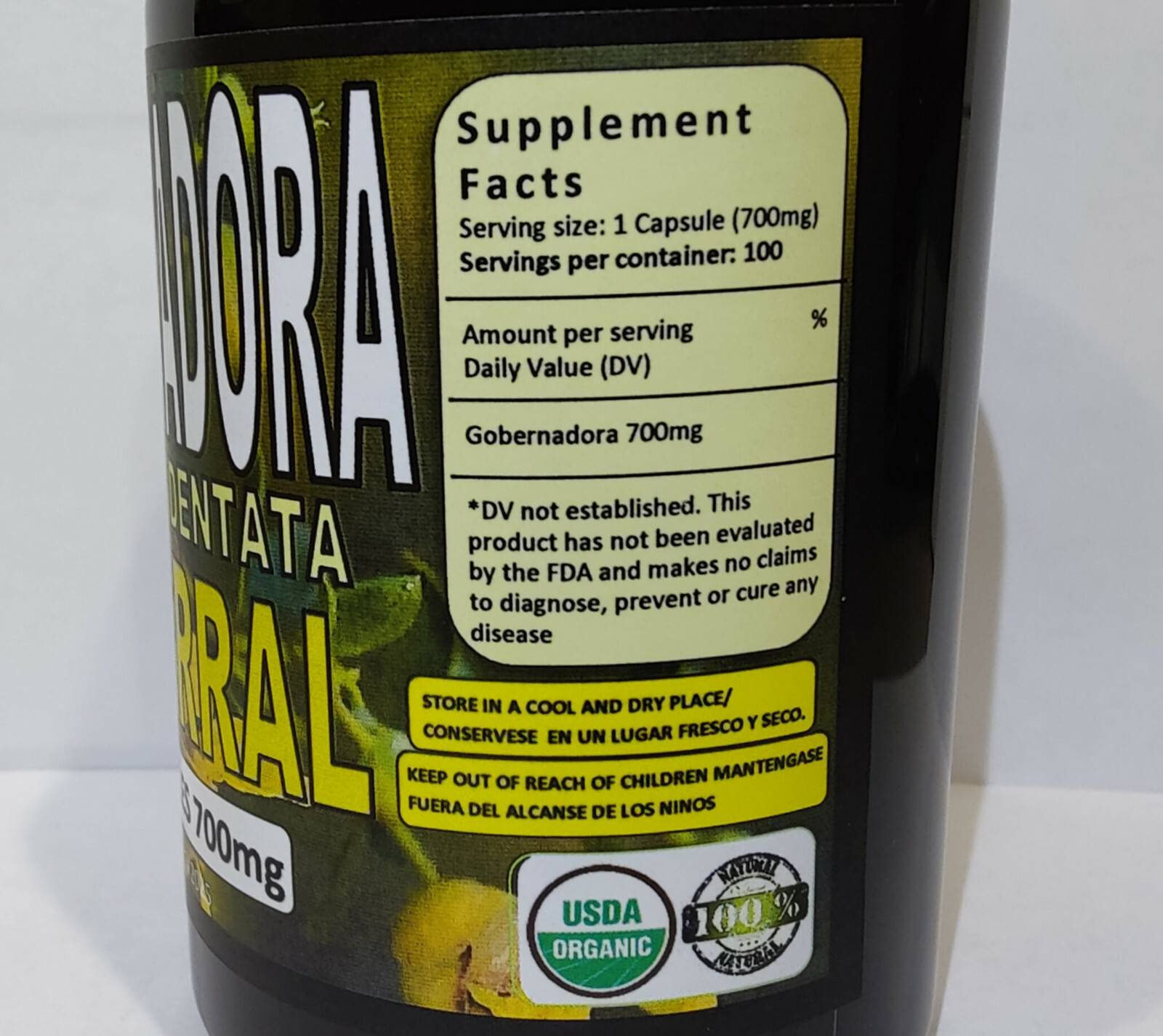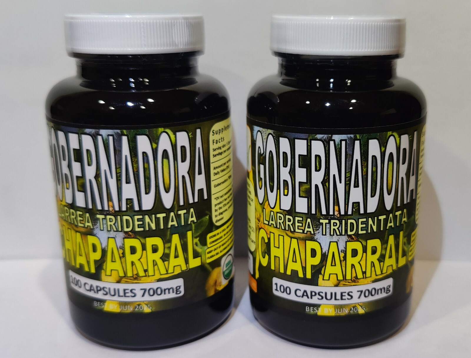 Gobernadora Larrea tridentata Chaparral leaf Natural organic 100 Capsules !!! Gobernadora Larrea tridentata Chaparral leaf Natural organic 100 Capsules !!! Gobernadora Larrea tridentata Chaparral leaf Natural organic 100 Capsules !!!1 Bottle 100 Capsules/Capsulas*Vea Tambien Chanca piedra * Vea Tambien Piedras en los riñones* Vea tambien inflamacion en la vejiga* Vea tambien infecciones urinarias------------------------------------------------------------------------------------------------------------------------------------------------* Importante/DISCLAIMEREL USO DE ESTE PRODUCTO ES RESPONSABILIDAD DE QUIEN LO RECOMIENDA Y DE QUIEN LO USA. * These statements have not been evaluated by the Food and Drug Administration. These products are not intended to diagnose, treat, cure or prevent any disease.* Estos productos no están destinados a diagnosticar, tratar, curar o prevenir ninguna enfermedad.Antes que decida tomar alguna planta medicinal o suplemento herbario, asegúrese de consultar primero con un profesional de la salud. Evite el autodiagnóstico y la automedicación: ¡Sea precavido (a)!